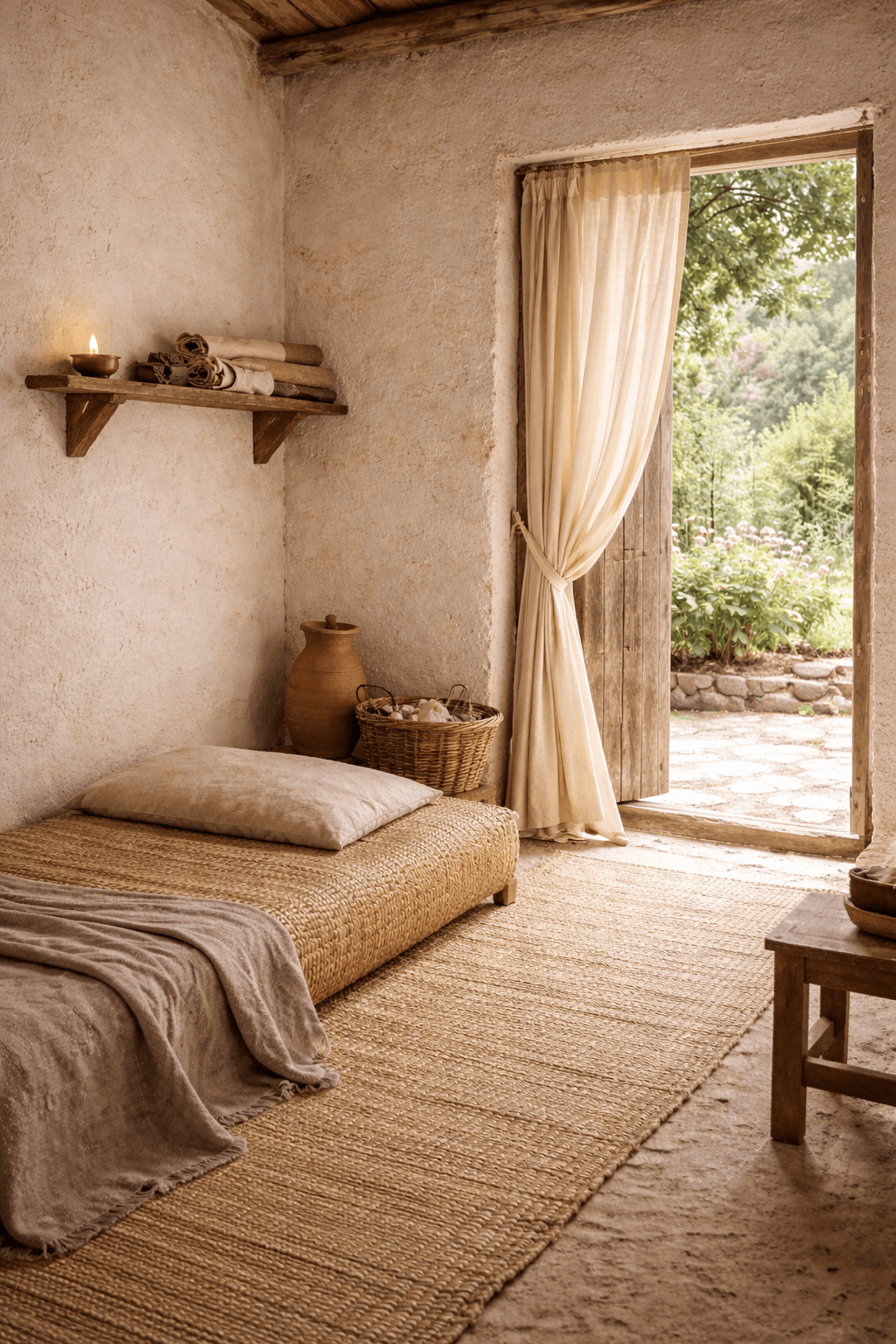 Contra una de las paredes se dispone un lecho bajo, casi a ras del suelo, sin cabecera ni ornamentos, cubierto con esteras firmes. En otra pared, una repisa sencilla sostiene una lámpara de aceite, algunos rollos colocados con atención y un trabajo de costura doblado. Cada objeto ocupa su lugar; la casa transmite orden, silencio, recogimiento.