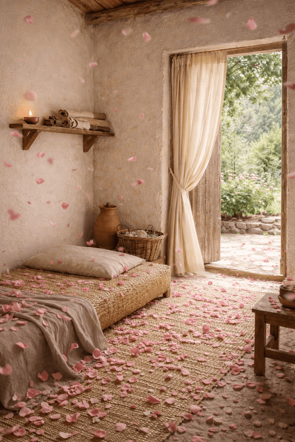 La luz entra desde el exterior de manera suave. No irrumpe, se filtra. Proviene de la puerta que comunica con el huerto, apenas velada por una cortina ligera que se mueve con el aire. A través de esa abertura, la casa respira el mundo exterior sin perder su intimidad. Cerca de la lámpara, una jarra con ramas floridas introduce un gesto mínimo de belleza cotidiana.